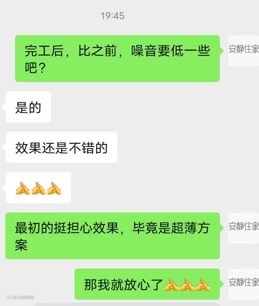 隔音完工,主家下班后去体验,现场感受了效果,完工反馈“效果不错”。