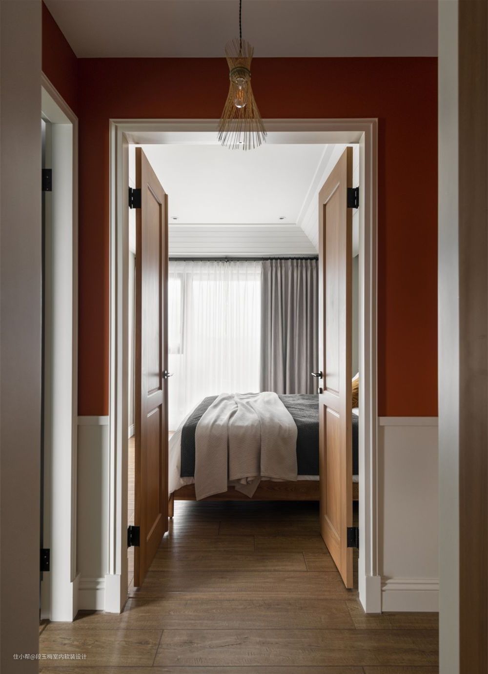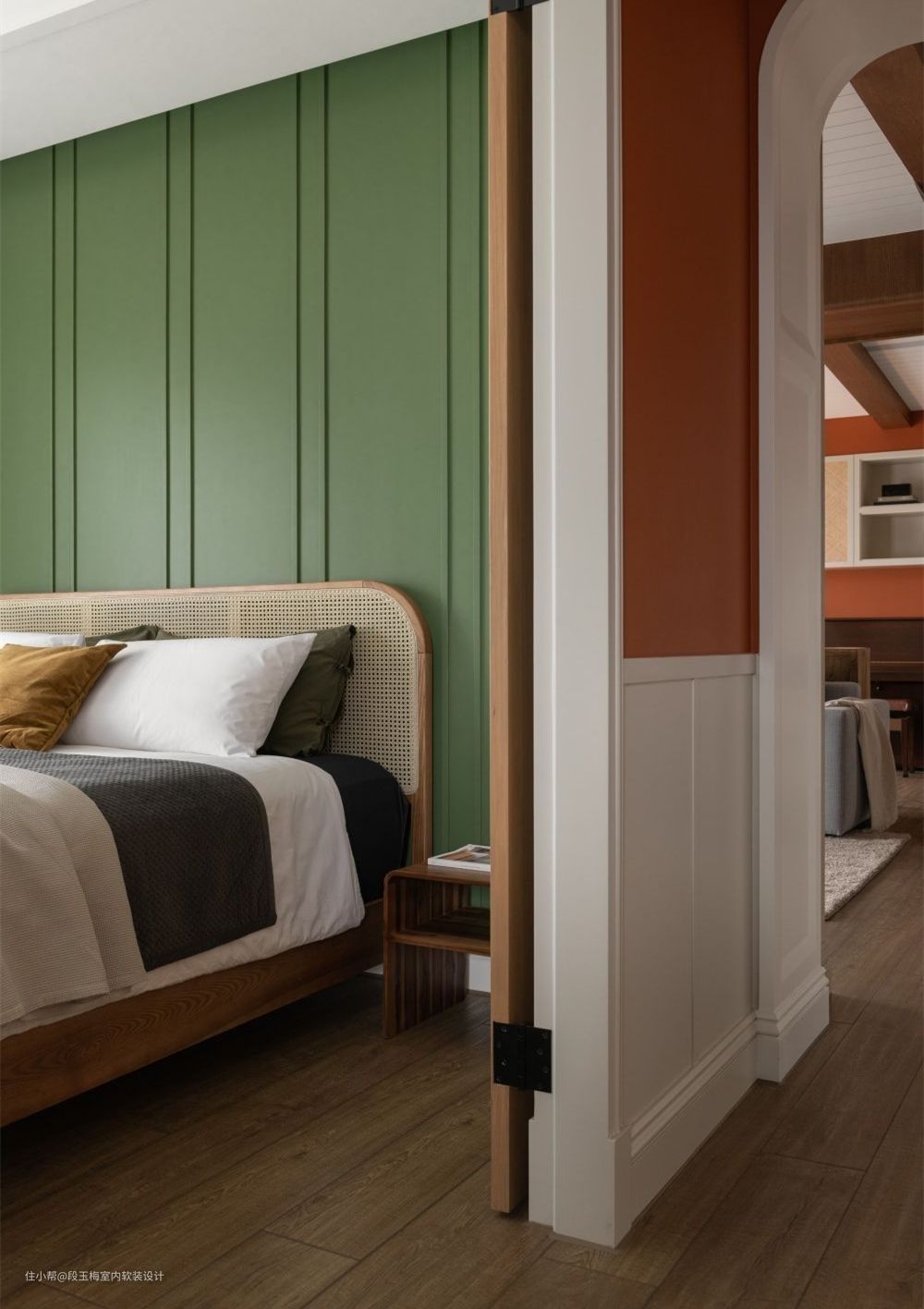 主卧背景墙引入绿意,休憩空间放松又惬意,而吊顶设计,则修饰突兀横梁、拉高视觉。设计师也特别使用对开门作为房门,更具仪式感的同时,方便亲子互动,让家人间的距离更紧密。