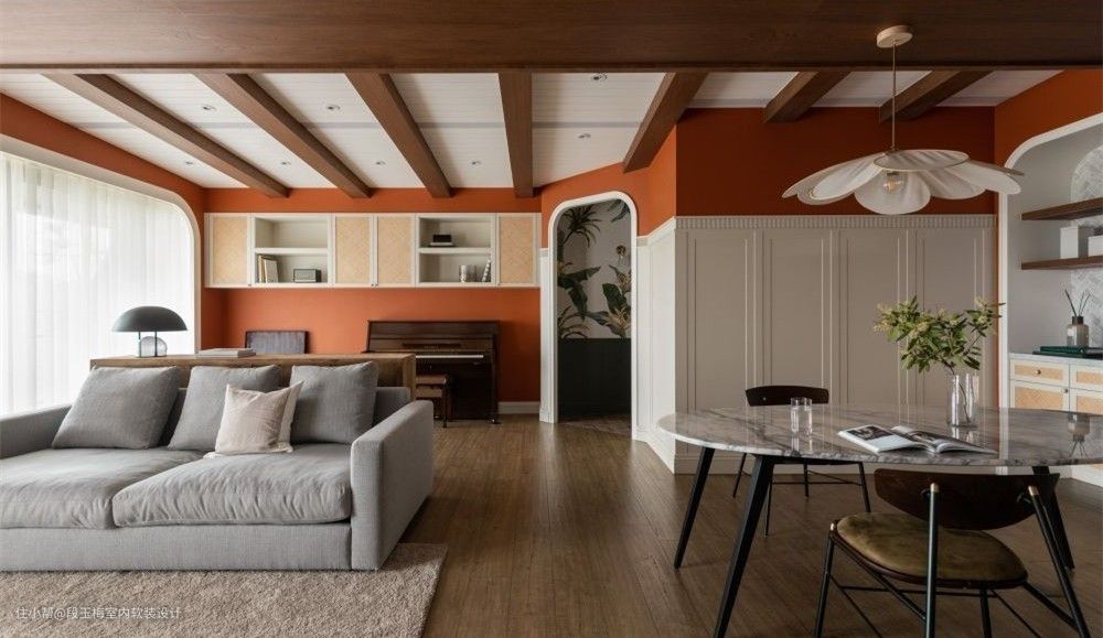看腻了单调的白墙吗?为满足业主需求,设计师选用饱和亮眼的脏橘色,以局部跳色的方式,妆点出活力与悠闲的空间氛围。