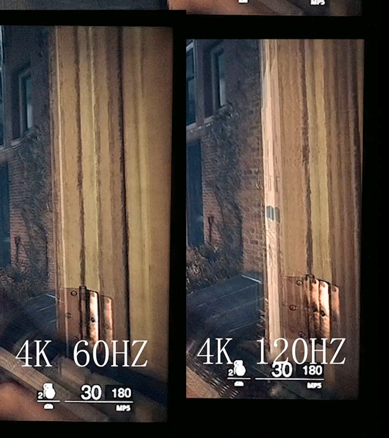 来,细看窗户的移动的轨迹,60Hz的两条残影间距离更长数量更少,因为刷新下一帧的时间更长,120Hz两条残影间距离更短且数量更多,其实正好是一倍的关系。