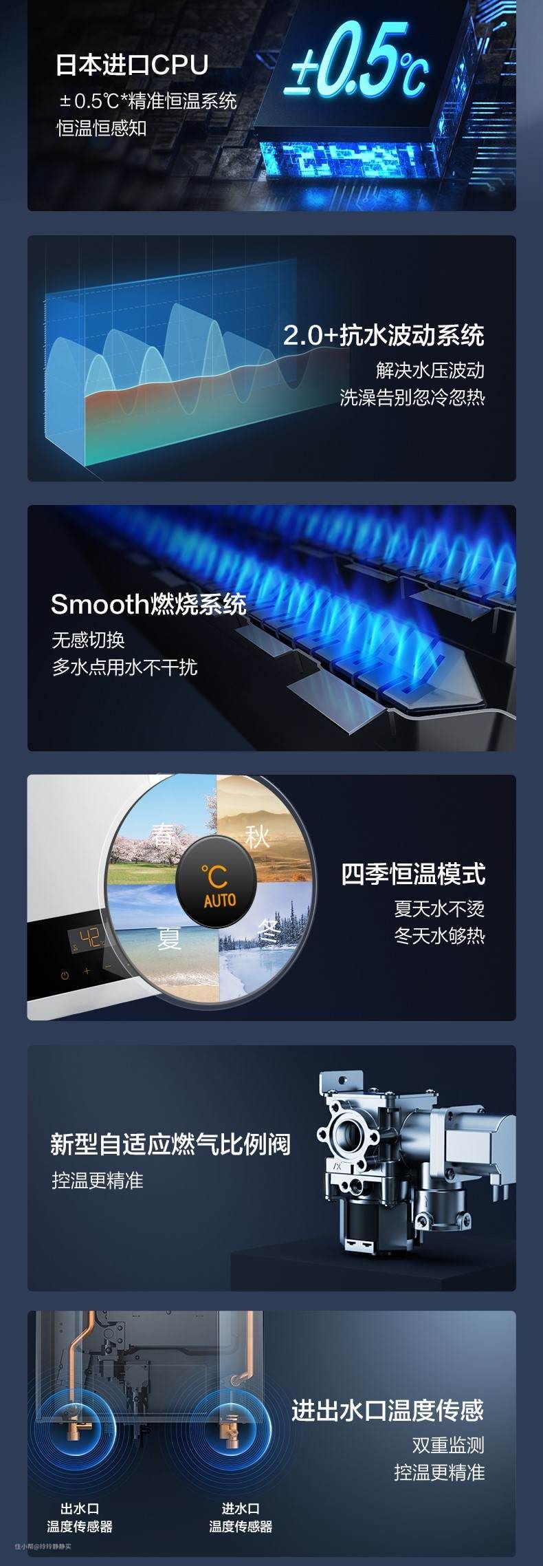 外表刚毅,内在也很细腻,有六大控温技术,如日本进口CPU,升级版抗水波动系统,进出水口温度传感,四季恒温模式(自动根据不同季节匹配合适的水温,避免夏天水太烫,冬天水不热),Smooth燃烧系统(无感切换,减少多点用水影响)等,水温不会忽冷忽热,增加了水气双调控温的稳定性。