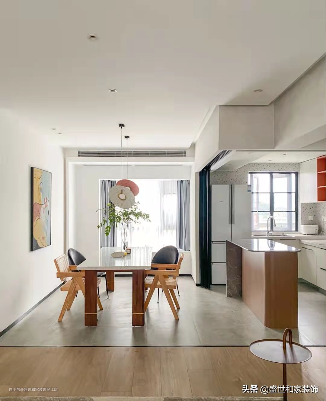 ② 主要小孩上学,在意整体空间通透感,客餐厅不设计多余柜子,砸掉阳台门洞处的门垛,使得客餐厅整体更加敞亮舒适。