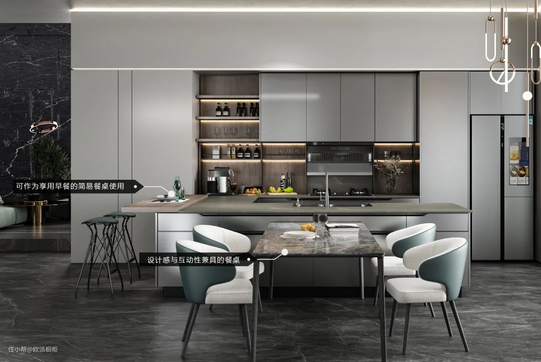 岛台旁的餐桌设计,浪淘沙石英石台面,花色高级材质耐用,加上特色的原创吧台脚,营造舒适的用餐氛围。
