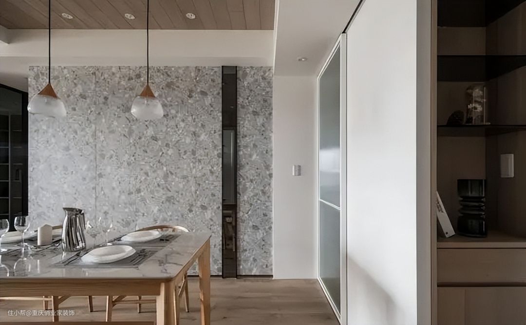 除此之外,将水磨石用作餐厅背景墙或厨房防溅墙也是非常不错的思路,不规则的纹理分布有效引人瞩目,让用空间立即成为一道靓丽的风景。