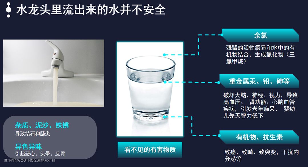 其中的一个,就是全屋净水系统,水是我们每天都要接触的。生活用水,饮用水两大块,对于一个高品质的生活来说,一个好的用水环境和体验,是必须的。现在全国许多地方的自来水水质其实都很一般,取水水库环境也和十几年前大不一样,自来水的标准虽然一直在提高,但是水源地的水质却越来越差,根据中国水质协会数据。全国有一半的城市,水中余氯含量都是超标的。这些余氯当中有一些氯的化合物,一氯甲烷,三卤甲烷等,都是一些强致癌物,长期使用没有经过过滤的水,自然是对我们身体是有一些危害的。