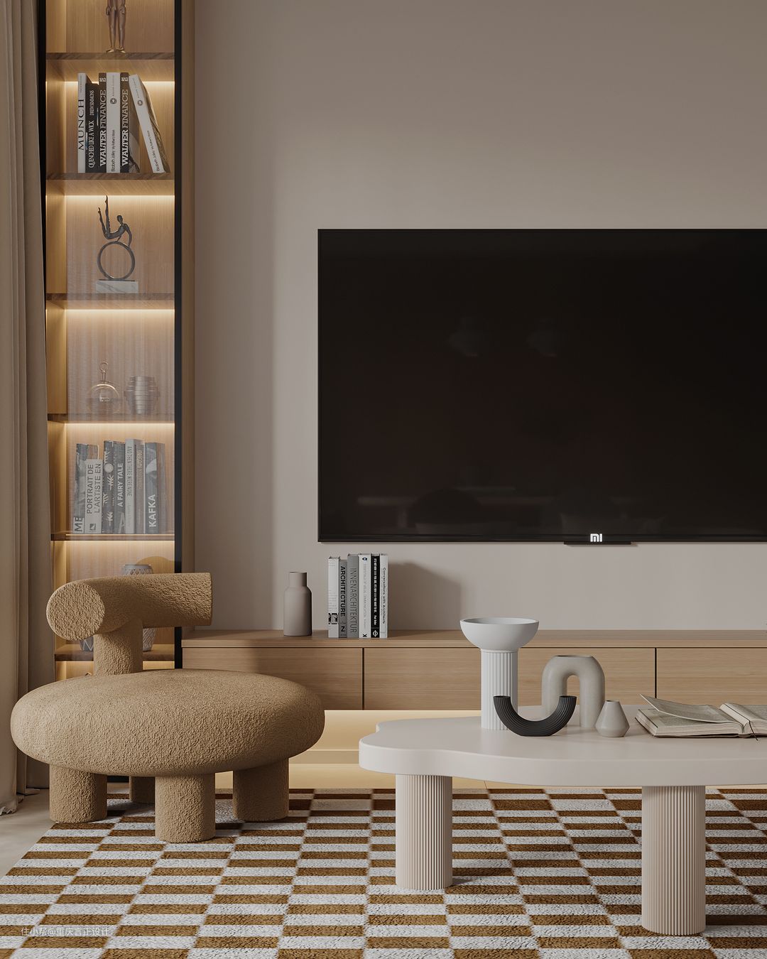 格子地毯与餐椅的相近色让整体空间更协调,半圆弧形沙与茶几及摆件增添了空间圆润感。