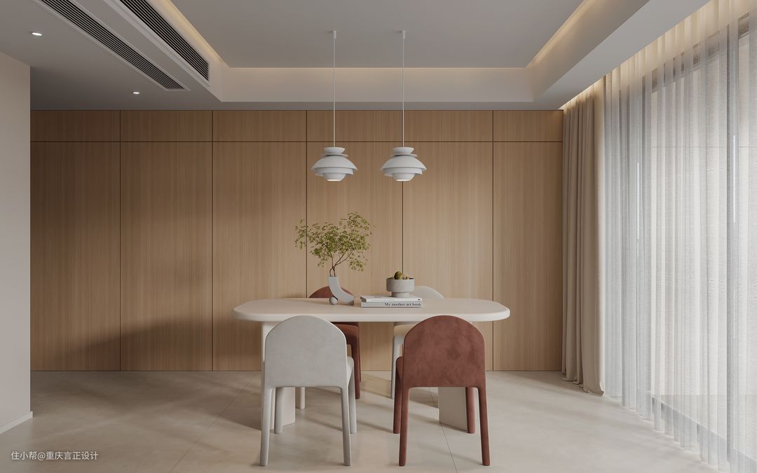 客餐厅使用无主灯照明设计,悬浮吊顶让整体空间更具有层次感;整体色彩搭配以奶油色的漆为基调,再配上原木色面板及棕色让整体空间温暖而沉稳。
