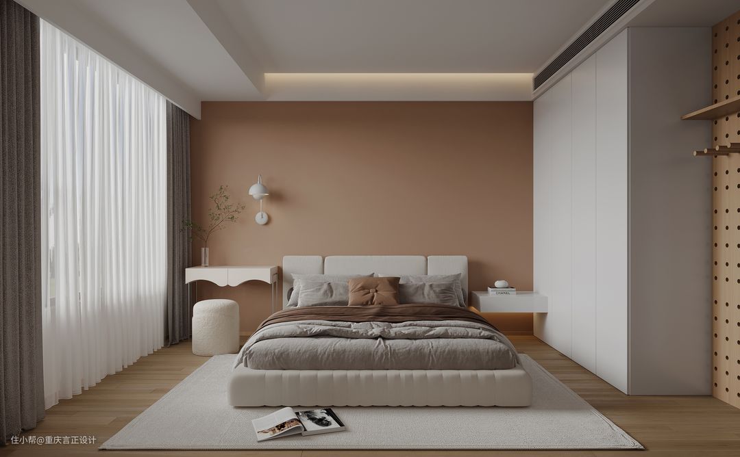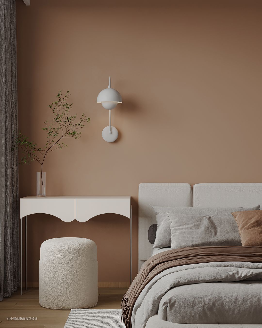 主卧一样延续着客厅沉稳的风格,以大面积的暗橘色来给予空间稳重,再极简性的衣柜让整个空间具有层次感。