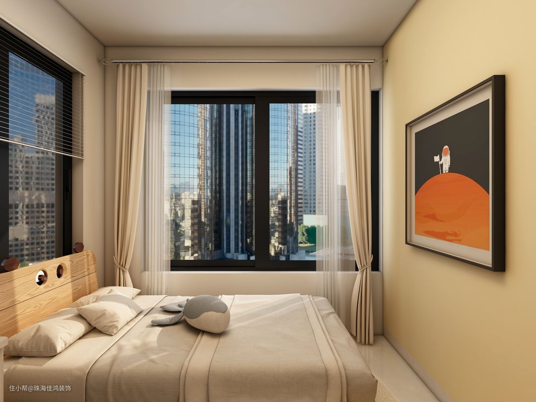 次卧平顶的设计给空间带来简洁、深邃的既视感。加上优渥的采光,每寸空间都透着岁月静好。