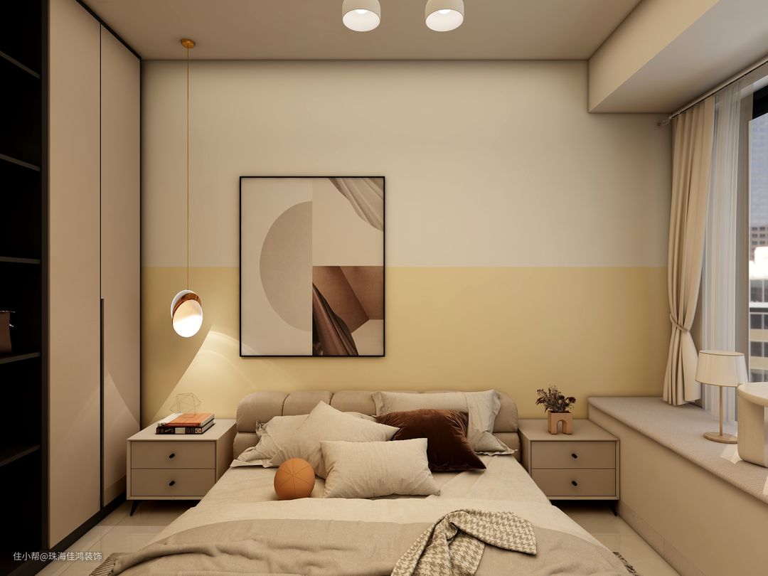 主卧延续了客厅的基调,墙面采用分色设计,利用上下的比例关系,营造出视觉上的高层高。