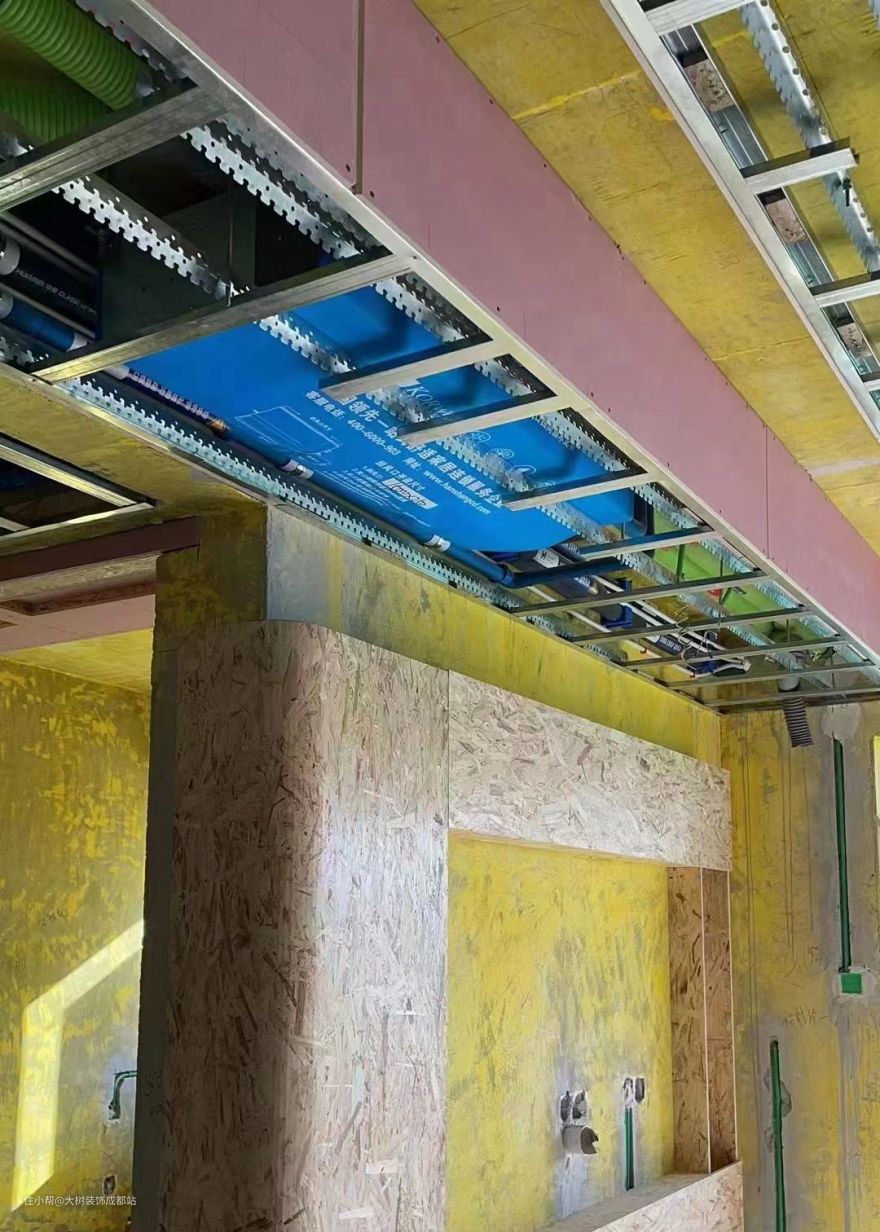❶ 先编骨,调试龙骨平整,后挂板封面,保证石膏板顶面平整度;
