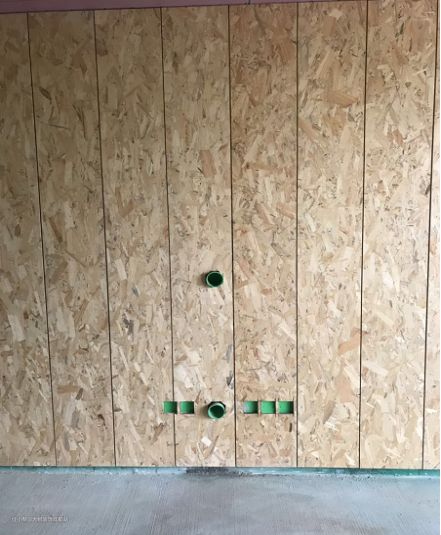 OSB板做形象墙基层,切割成300*300mm拼接,接缝处必须留5mm缝隙。