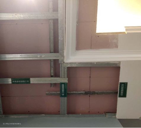 ❷ 下返假梁,石膏板左、上、右探到原墙开槽100mm处,后方打发泡剂固定。