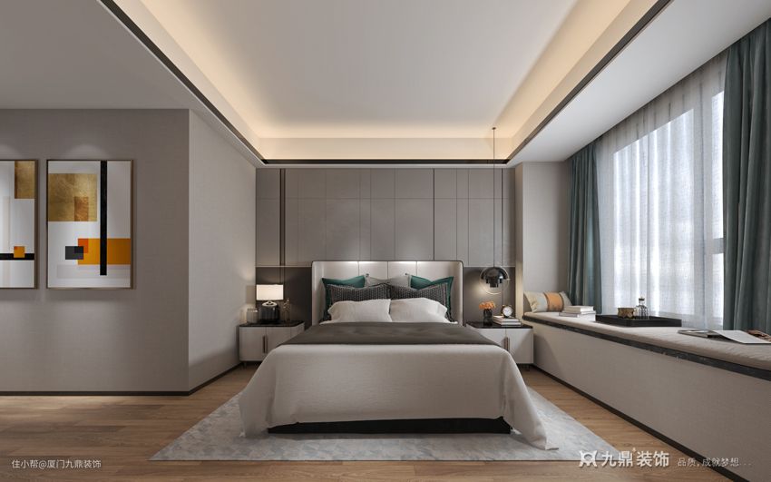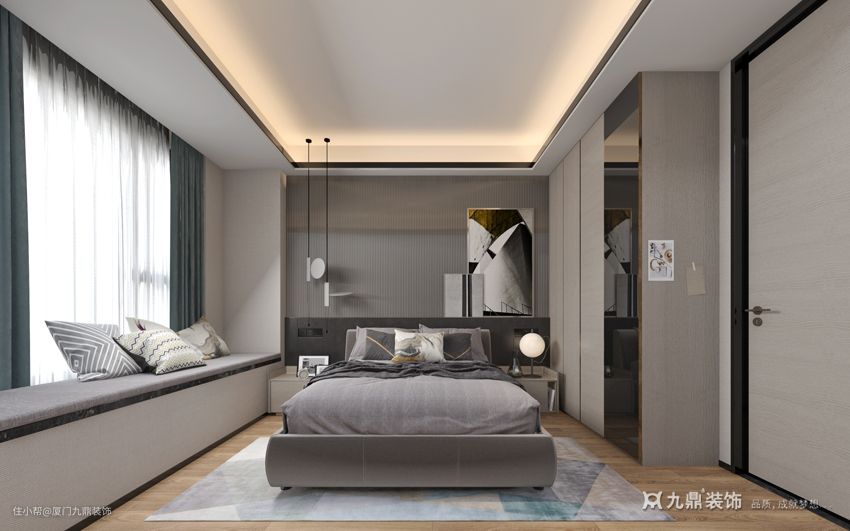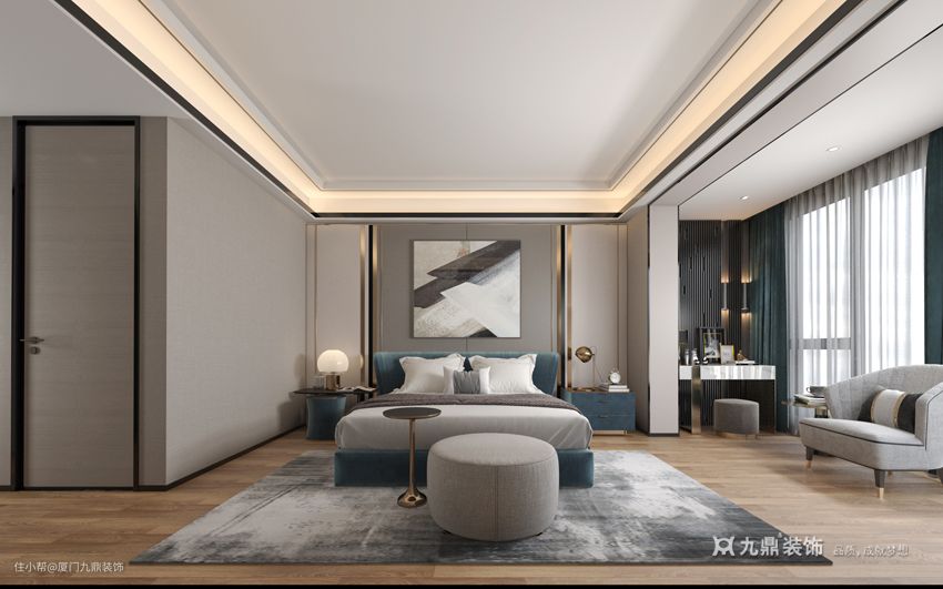 如图所示,灰色为主,丹青色为辅的卧室里,使用布面的家具、窗帘与毛绒地毯,采用弧形的家具外边,在落地窗大面积的采光下充满着松软感,安全感,使人的心情自然的放松,不再被外物的影响下变得繁杂,淡木色地面生出的自然气息让人在‘钢筋铁骨’的城市中拥有一颗温暖的心,安心便是设计主卧的中心思想。金属材质的元素是在自然之中对于人类发展的启示,使用了方形的吊顶、背板、艺术画、门槛丰满了主卧中“无规矩,不方圆”之意,更是‘家’的体现。
