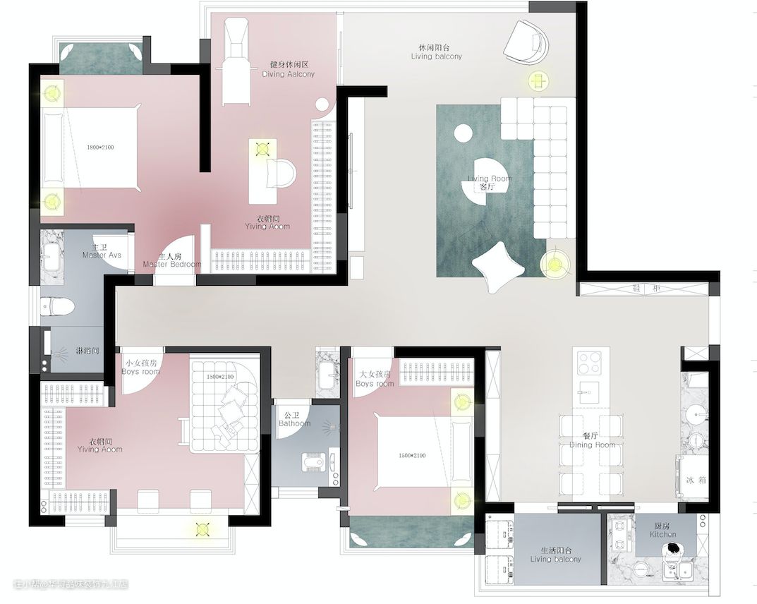 1. 因业主家中有2个女儿,希望女儿们都能拥有独立的房间,大女儿希望房间有个书桌可以学习,想要粉嫩的少女风,小女儿则想要个飘窗可以坐在上面看书。