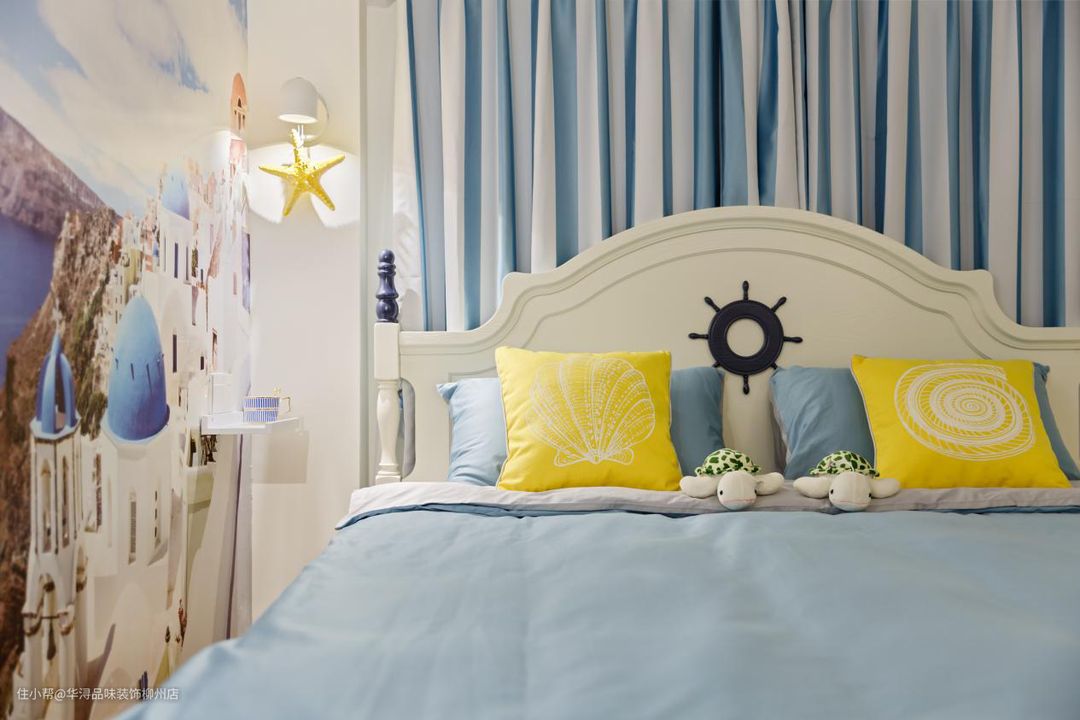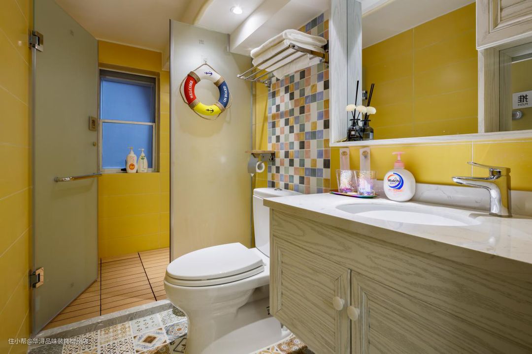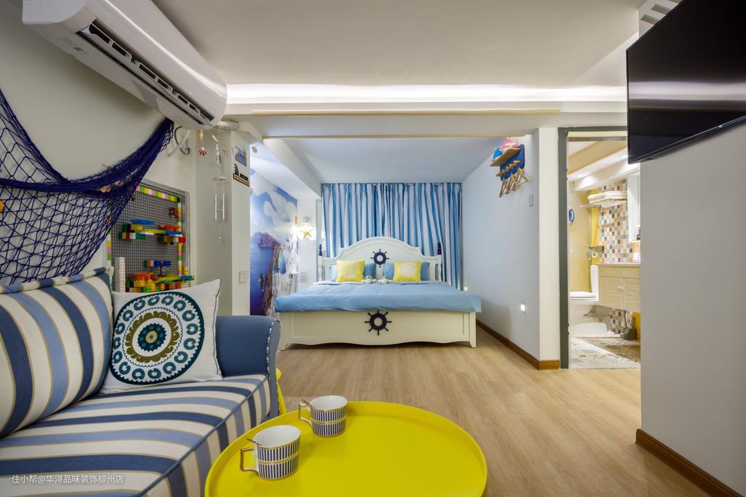 这个房间按照小孩子的需求,简单明亮。整体运用了亮黄色与白色作为搭配。卧室主要是白墙与蓝色的床具窗帘,使整个房间显得通透明亮,充满青春活力。男孩子也比较喜欢海军风,所以在家具的选择上使用了经典的条纹蓝沙发,窗帘。洗手间的装饰还有游泳圈,墙面整体基本都是鹅黄色,增加了整个的亮度。