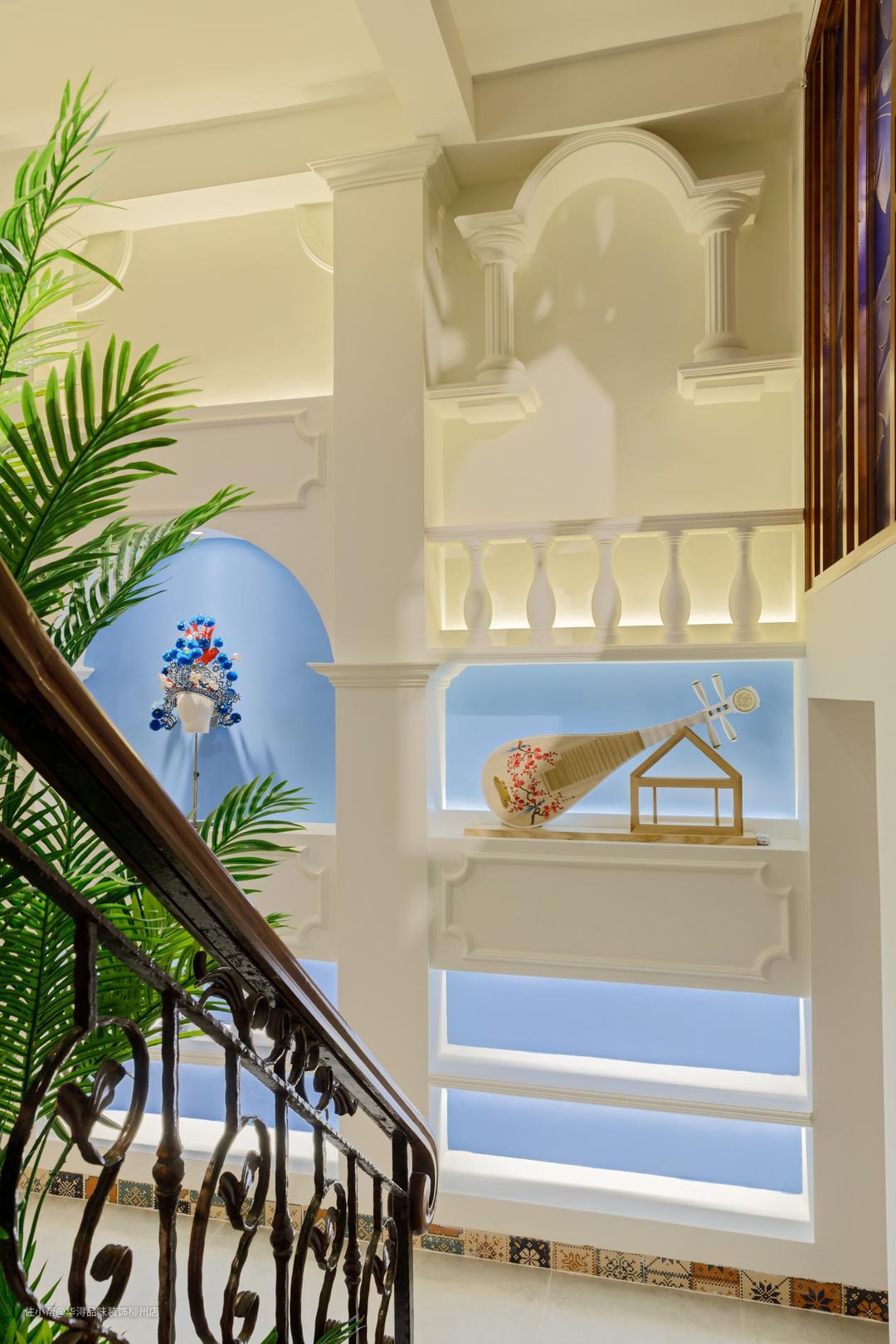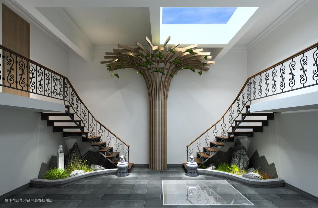 过道两旁是整个楼层楼梯的延伸,两边楼梯是对称展开;两边都可以上楼,铁艺雕花的楼梯护栏也是充满了年代的设计感。立体的树形大柱子与半开的天井也是充满了设计感的搭配。