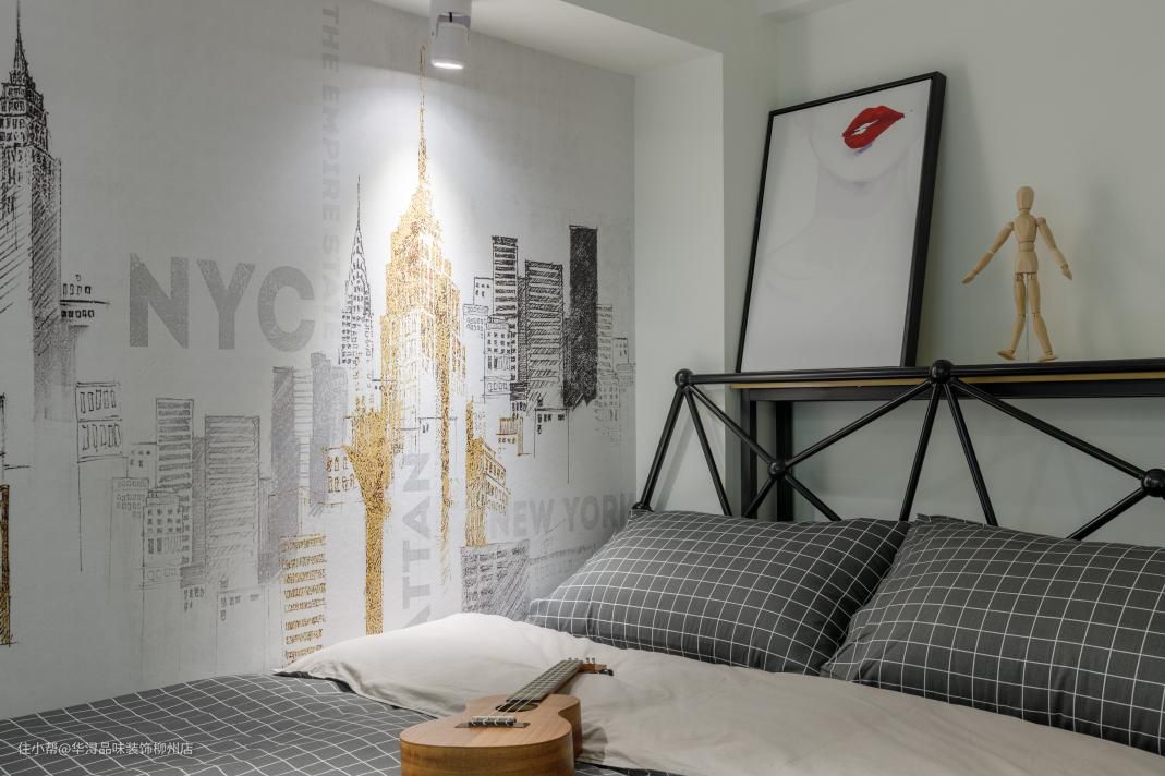 根据业主的需求将房间设计有主卧次卧两个房间,主卧的色彩背景也是沿用了西关大屋的色彩搭配“红与蓝”床上用品以及化妆台上的色彩也是相呼应。另一个房间则是用了现代的极简风格搭配,大白墙与黑白灰色彩是永远不会过时的。