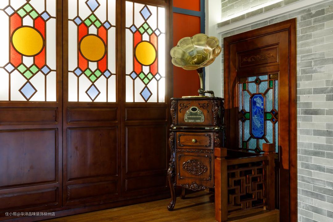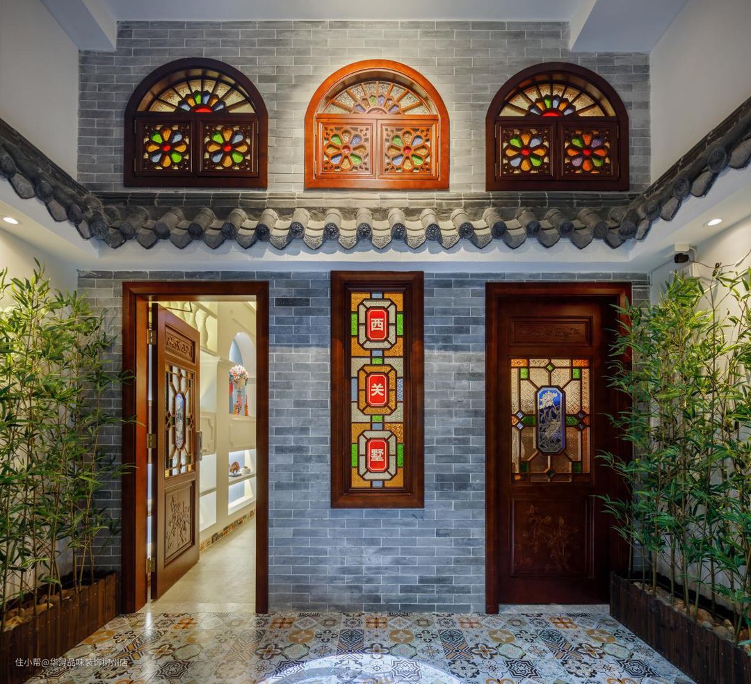 设计师根据业主的要求以及西关大屋传统特色,在入户大门也是费了不少心思。枣红色的大门对开,两扇缤纷多彩的西关满洲窗平行而立。青砖绿瓦水泥地以及窗下神龛,处处细节都展示出了地地道道广东特色。