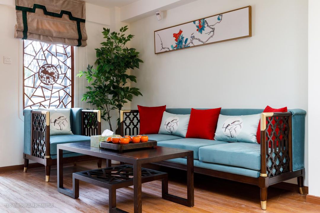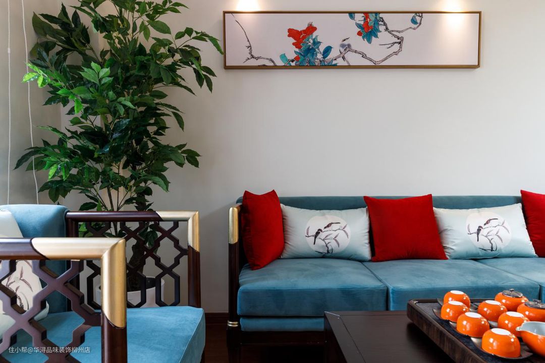 客厅里木质的隔断屏风将客厅分为独立而又相交的空间;大白墙上一副漂亮的装饰画与沙发色彩搭配相呼应,处处都有细节体现,这也展示了设计师的巧妙心思。桃木色的茶几与之搭配的茶具,太师椅在整个空间也是点睛之笔。