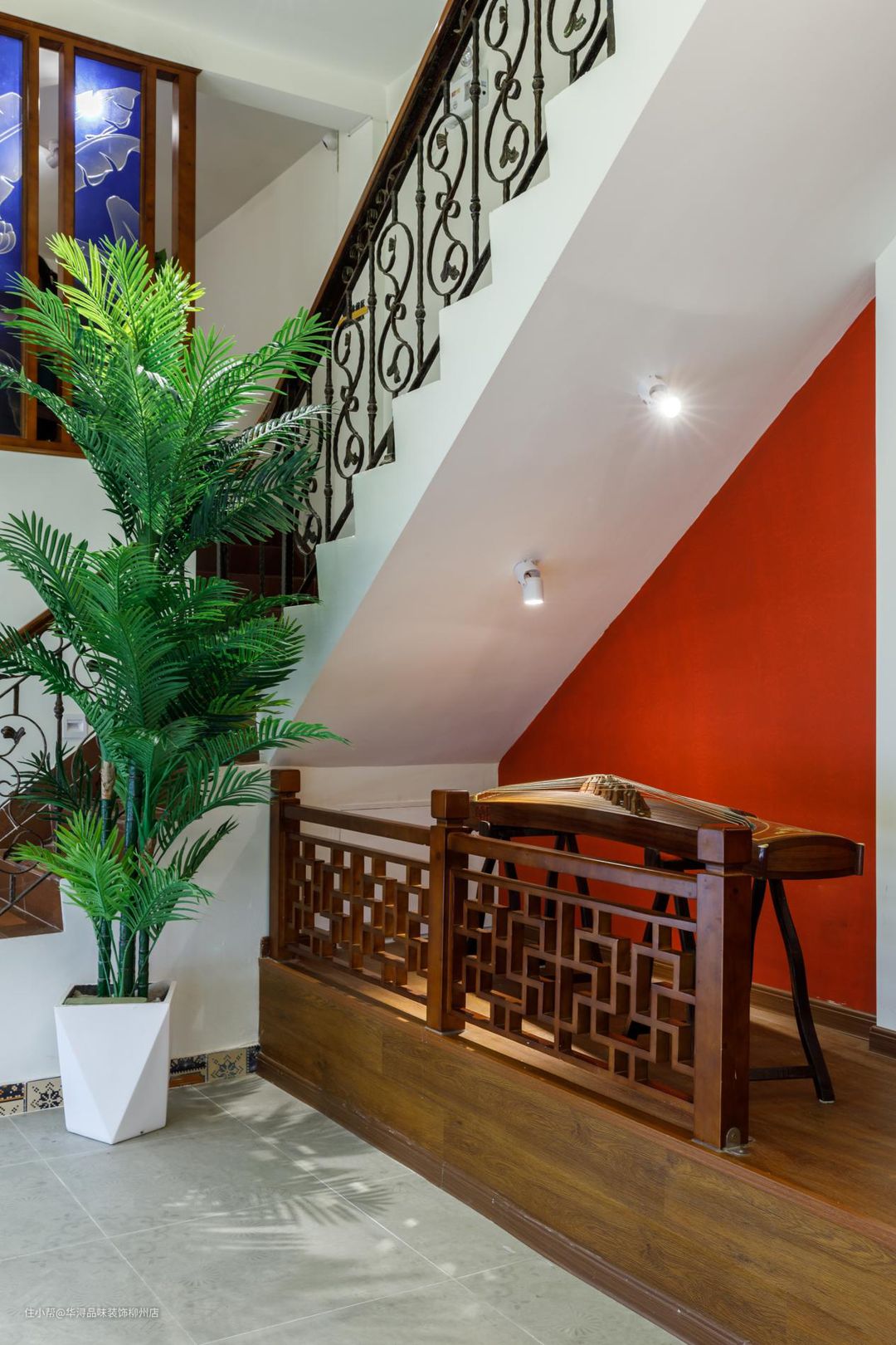 夹层中庭也是整栋大楼的设计亮点所在。从楼顶天花玻璃的色彩斑斓到中庭门户玻璃都是采用了色彩鲜明的“西关大窗”特色,其中主要色彩有:红、黄、蓝、绿等组合在一起。楼梯口生命勃勃的绿植搭配着楼梯下一架古筝,使那个角落增加了古色古香的韵味,也充分利用了空间。使那里发挥了空间的作用,更加不浪费每一寸面积。