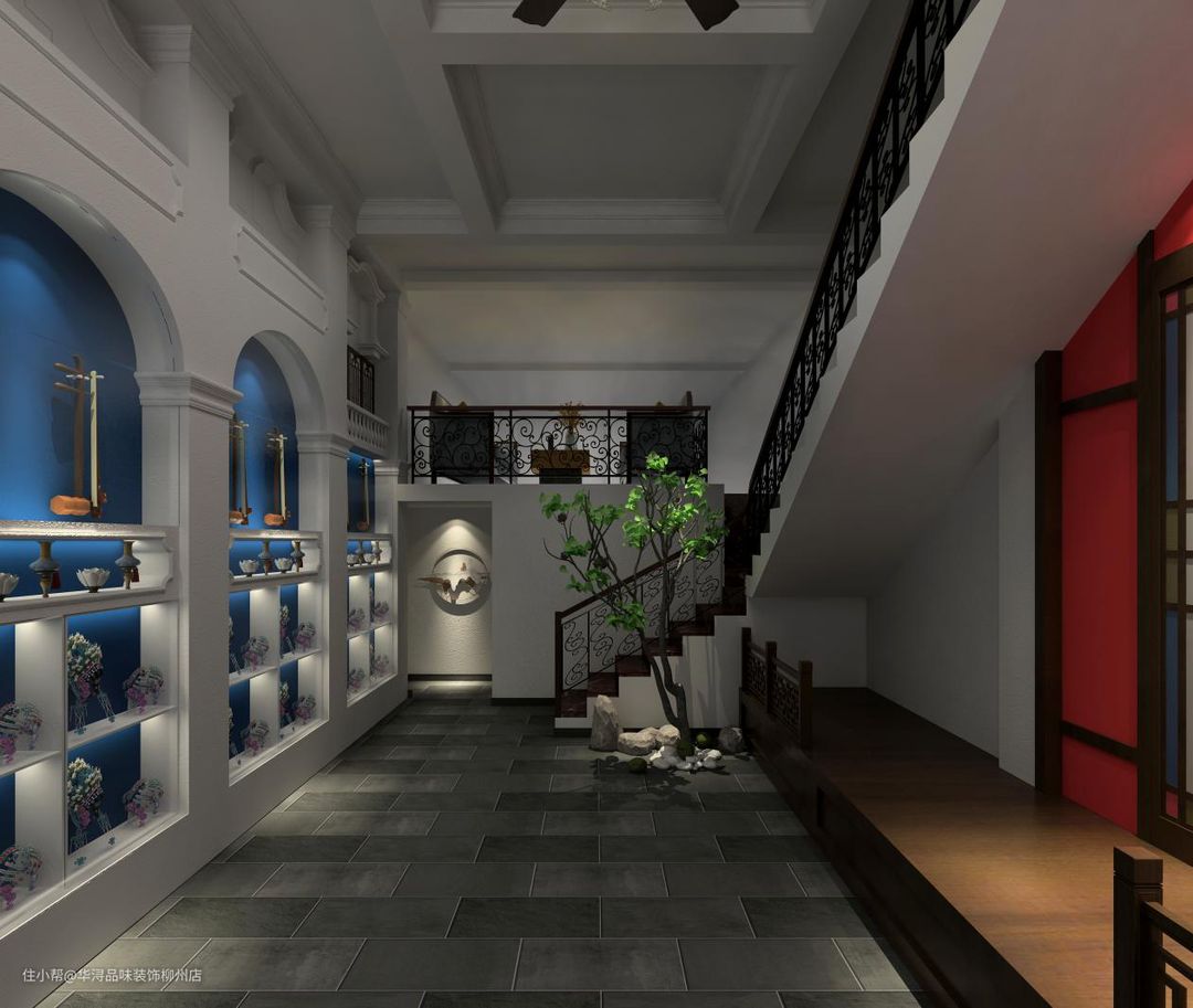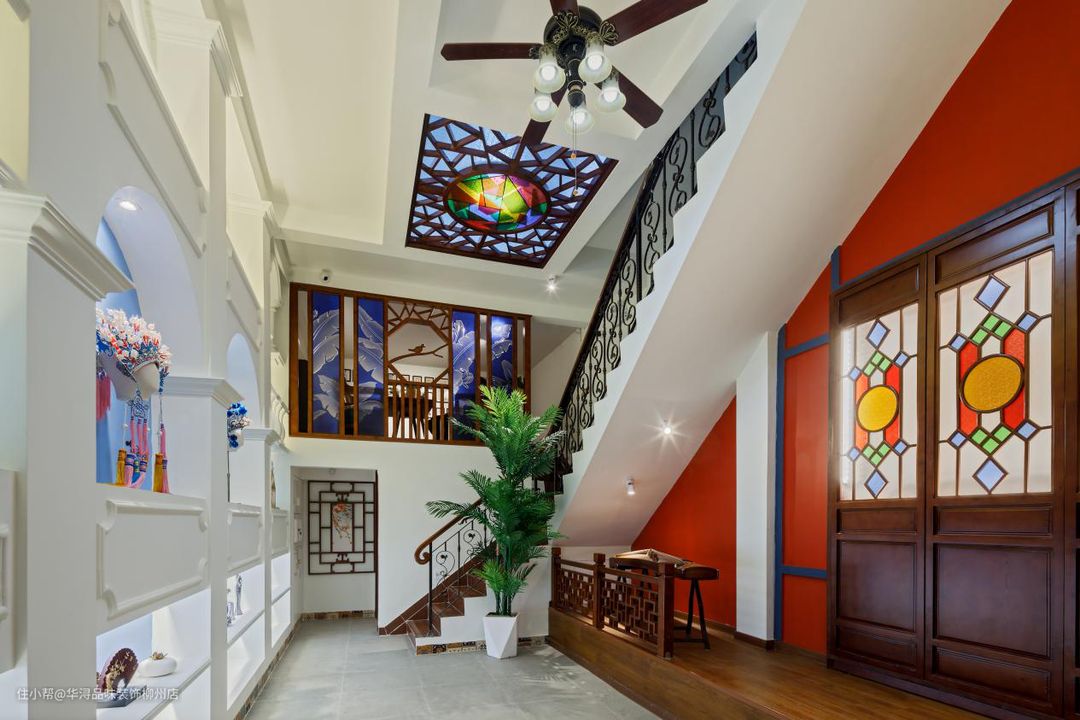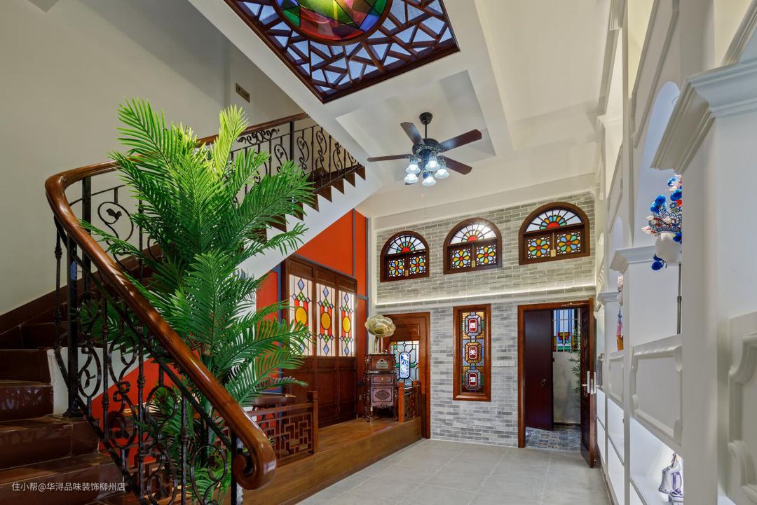 根据业主的要求,从大厅的石板地砖,窗户也是使用了蓝灰白这些色彩搭配突出了西关大屋的特点。入户的大厅正对着窗户在灯光的照射下也能若隐若现“西关墅”几个大字。屋顶的吊灯加风扇的设计也是独具特色。