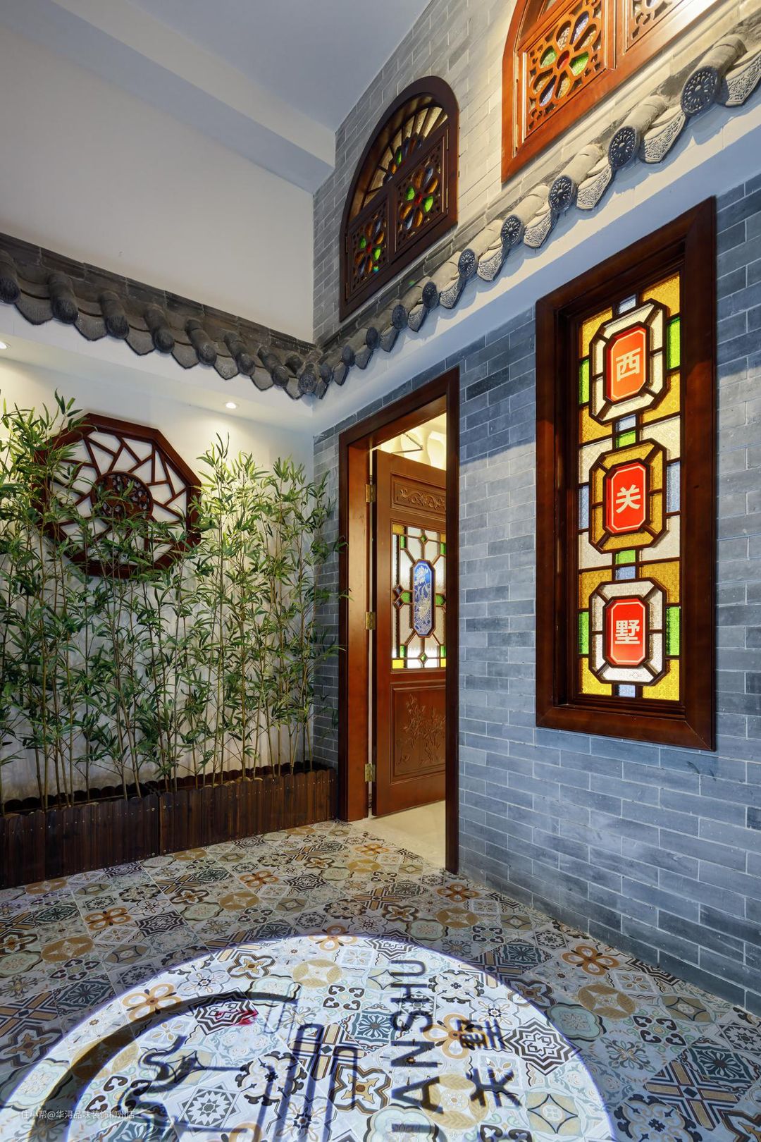下面也是这里展示的细节亮点之处,前面说了从中庭过来就能看到若隐若现的“西关墅”现在就能看到它的真面目了。西关墅几个大字是被镶嵌在窗户里,这扇窗户也是充满了特色——色彩斑斓的搭配更具有魅力。根据业主的需求,我们也在屋顶安装了投射灯将“西关墅”投射在地面,放大的字体也更加清晰具有艺术气息。
