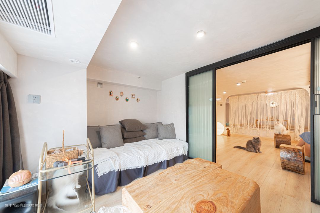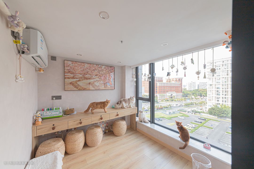 客人的的休息区猫咪也不排斥,落地窗的设计让房间更显宽敞,突出了与自然的和谐,原木色的设计让房间更温馨美好。