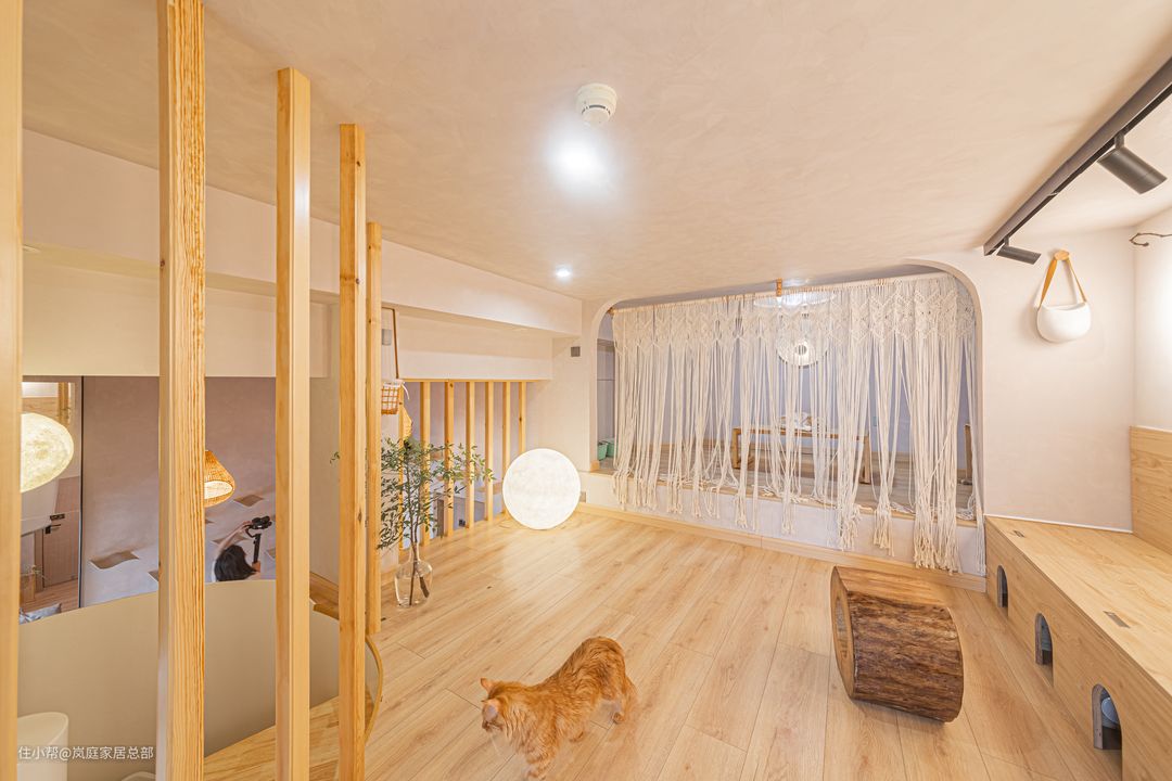 所以在设计的时候,更加偏向于自然的设计,整个客厅的设计采用原木色的暖色系,使得房间看起来更加温馨。暖色的吊灯,搭配旁边的猫爬墙,不管是猫咪的举动还是房间的温暖,给人都是一种非常温馨自然的感觉。