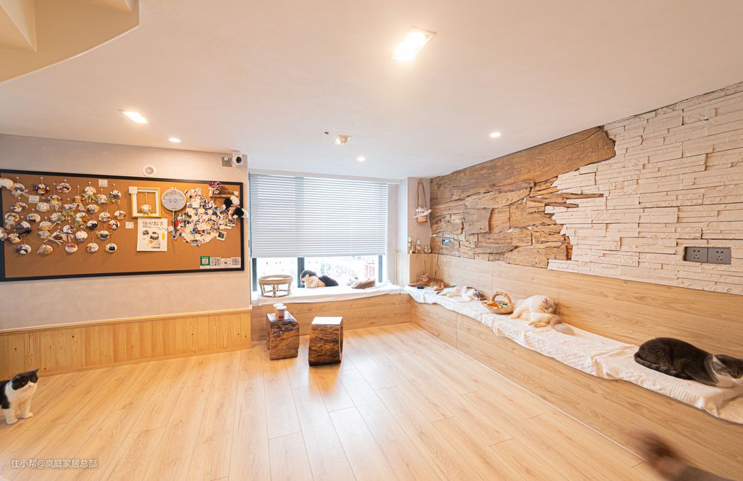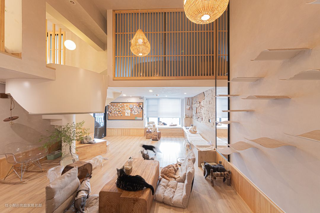 原木色的装修更贴近自然,猫咪也忍不住与人互动
