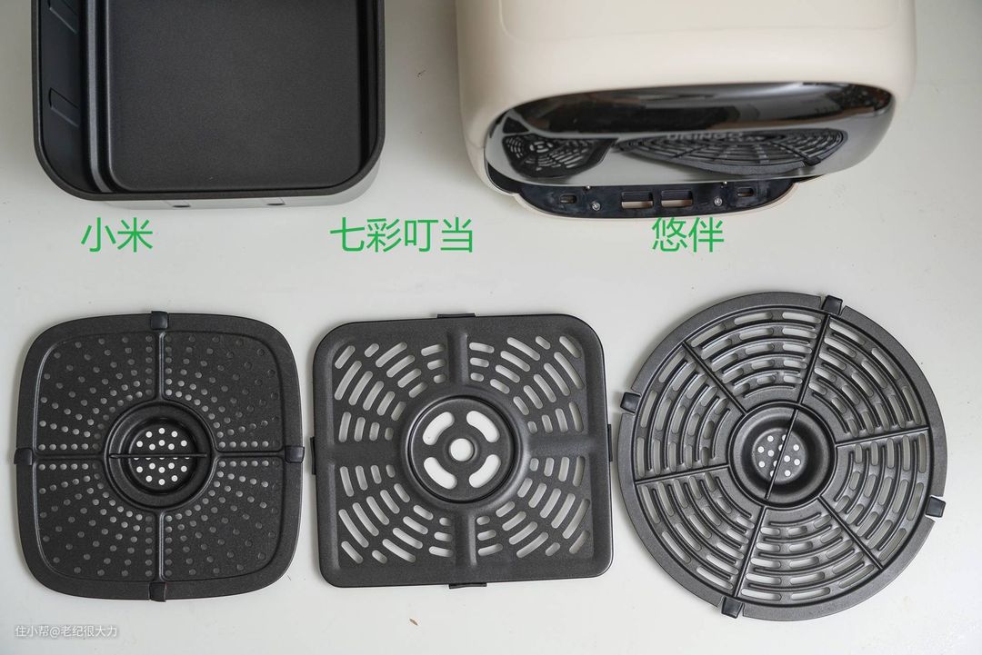 3款空气炸锅的烤网表面积都差不多。虽然绿色的悠伴圆形烤网看起来更大,但是表面积其实并没有大,如果遇到方方正正摆放的东西比如焗饭的方形钢化玻璃保鲜盒,那它的容纳能力反而不如另外两款。