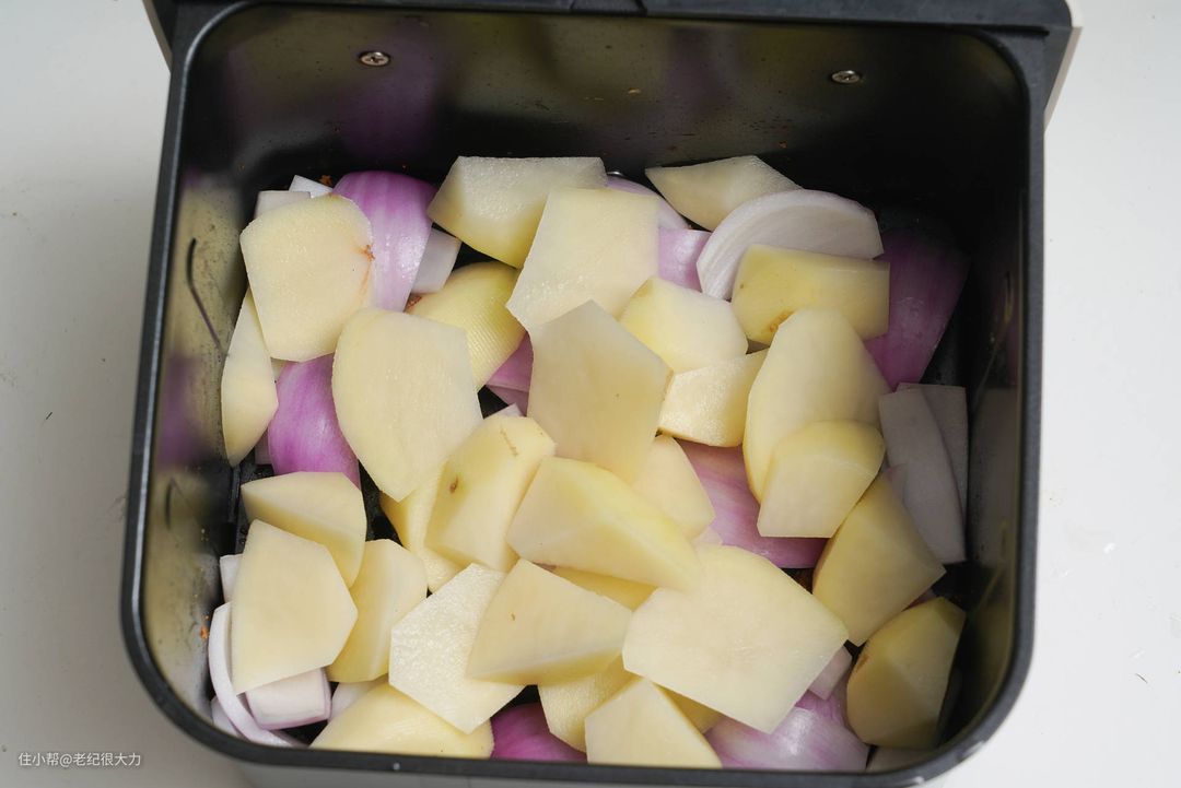 这时候把洋葱垫底,铺上土豆,不放肉,先180度烤10分钟。因为土豆不易熟,而五花肉15分钟就熟了,所以要先把土豆烤10分钟。