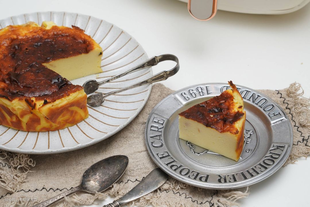 很多空气炸锅制作巴斯克的配方里并没有锡纸包住这一步,这样是不对的,除非你使用无菌蛋。根据我的经验,空气炸锅的热风10分钟就能把蛋糕表面烤糊,这时候中心的蛋糕液可能刚刚升温,根本烤不熟,所以要用锡纸包住。