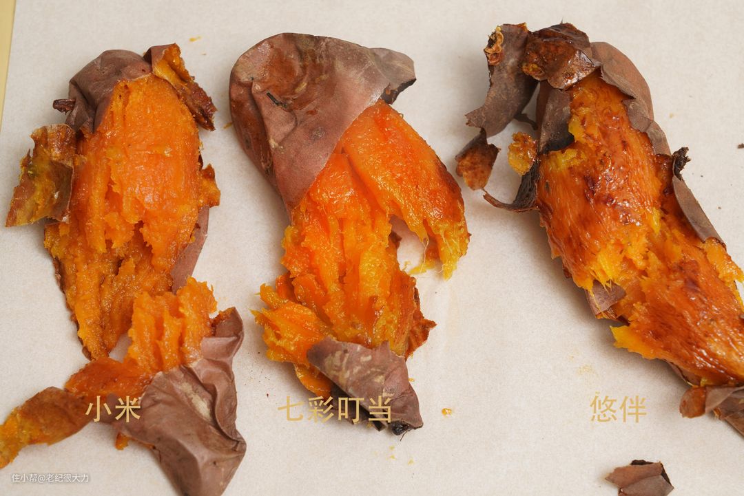 先不管那些,看看地瓜烤的怎么样。三个空气炸锅烤制的地瓜皮都可以轻松的剥离,看起来和小时候路边卖的焦炭烤地瓜一样。左侧的小米表面没有烤出焦褐色的焦斑感觉火候差了那么一丢丢,而右侧的悠伴烤的颜色过深了。中间的七彩叮当相对表现最好,不仅烤出油而且烤出焦斑,口感比较黏润而且不会太水。