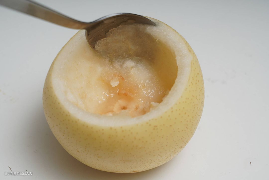 雪梨用勺子挖空,注意梨子底部是凹陷的,我们只要把梨核彻底挖掉就可以,千万不要更深否则会挖漏的。雪梨的侧面也尽可能的挖薄一点,挖出来的肉可以直接吃了。