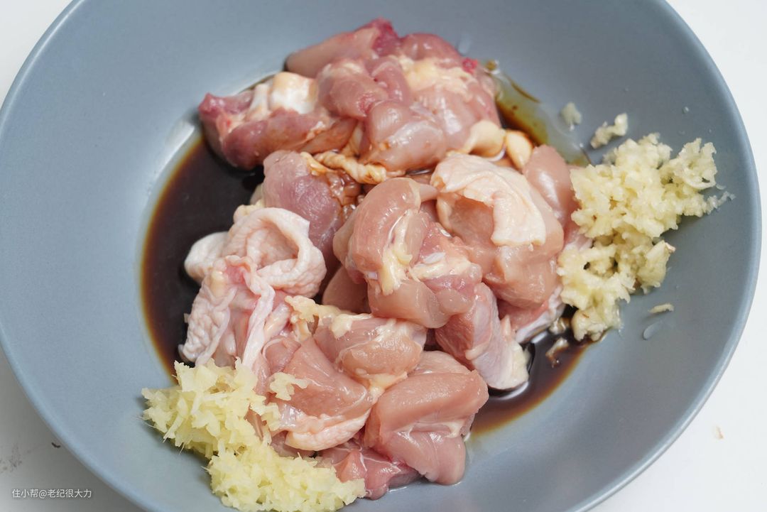 鸡大腿去骨后切块,不要切太小,也千万不要把鸡皮弄掉了。用姜末、蒜末、麻油、酱油拌匀稍微腌渍一会。