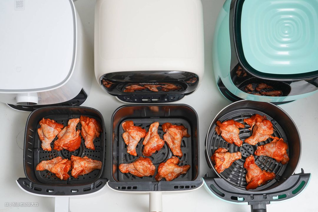 从放置鸡翅的数量来看,小米和七彩叮当最多可以放8个鸡翅根。而由于悠伴圆形的结构和鸡翅根一边大一边小的造型比较适合,可以放9-10个。