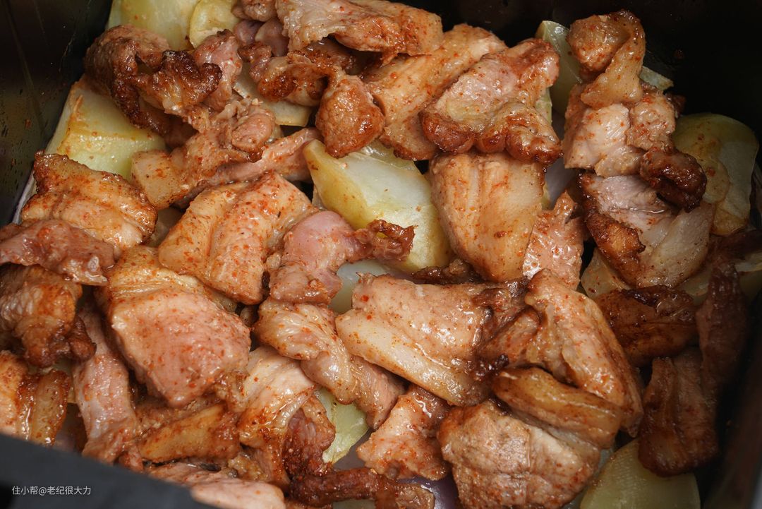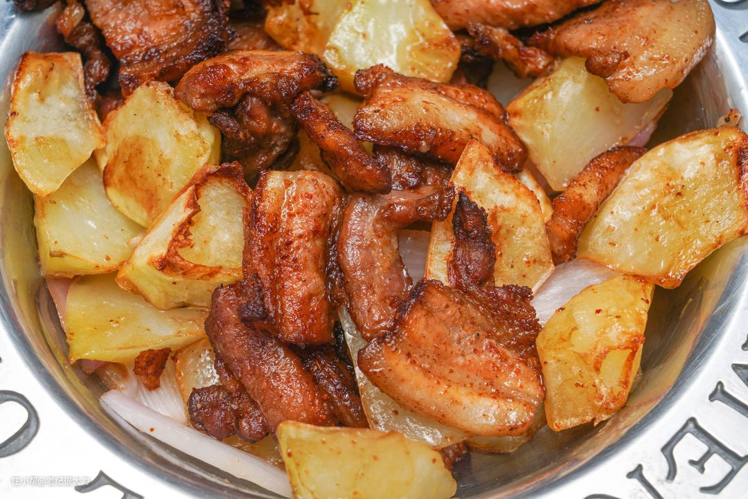 10分钟后拉开抽屉铺上五花肉,均匀一些,这样烤出来的油能流到土豆上,让土豆更好吃。