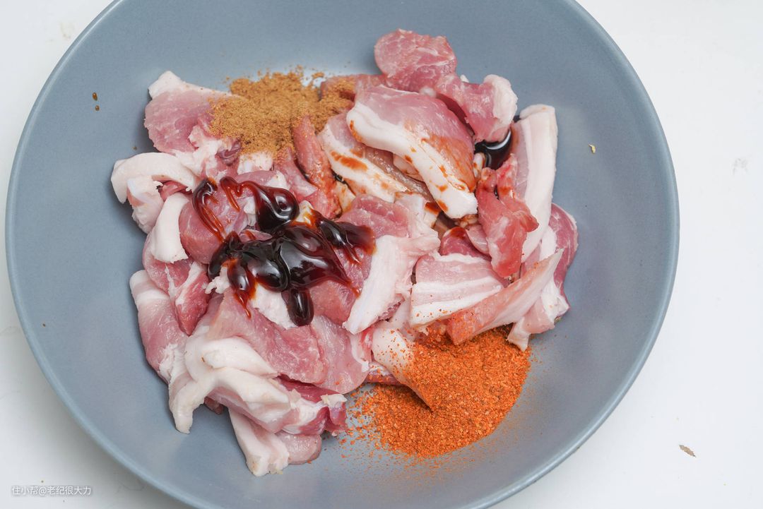 只烤五花肉太不健康了,加点土豆就好多啦。五花肉用辣椒粉、五香粉、生抽和蚝油拌匀腌制一会。