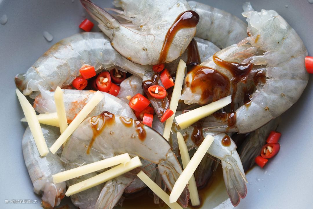 大青虾用姜丝、小米椒、料酒、蚝油和生抽腌渍30分钟即可