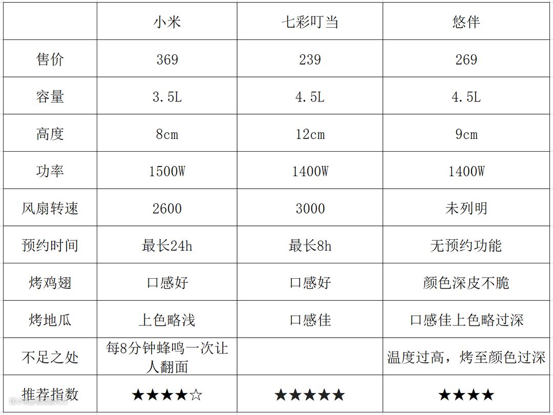 对本文中横向对比的三款空气炸锅做一个对比总结,首先是我制作的表格,能更直观的看清。