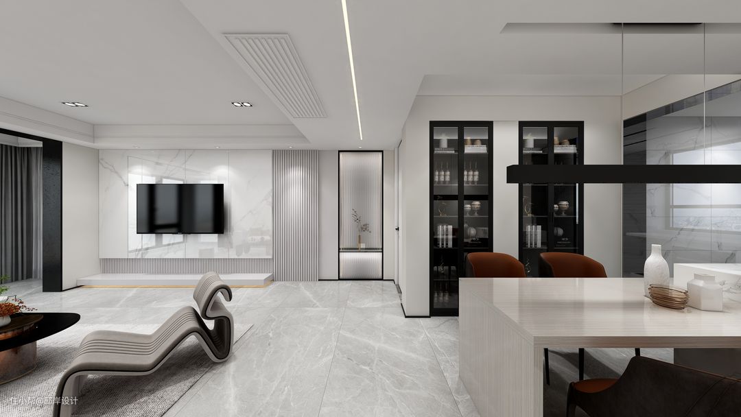 客厅沙发背景采用木饰面板装饰,增加墙面装饰灯带增加层次感,富有设计感的落地灯给屋内增加氛围,沙发背景一侧设计洗墙灯,通过灯光的调节与乳胶漆的分色处理,来划分整个背景墙,增加设计的层次感。