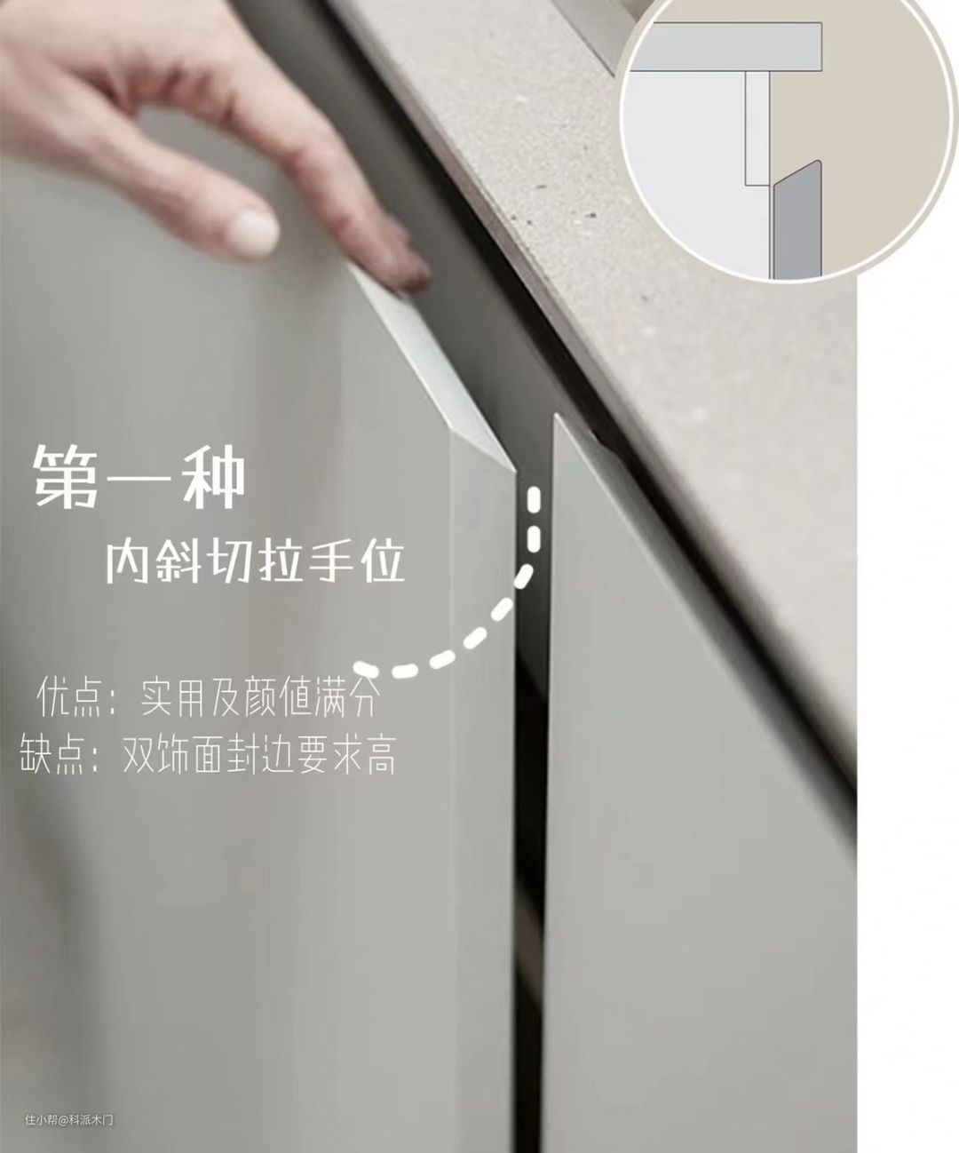 第一种45°斜切拉手:门板顶面到台面的距离最好大于15mm,20mm为佳