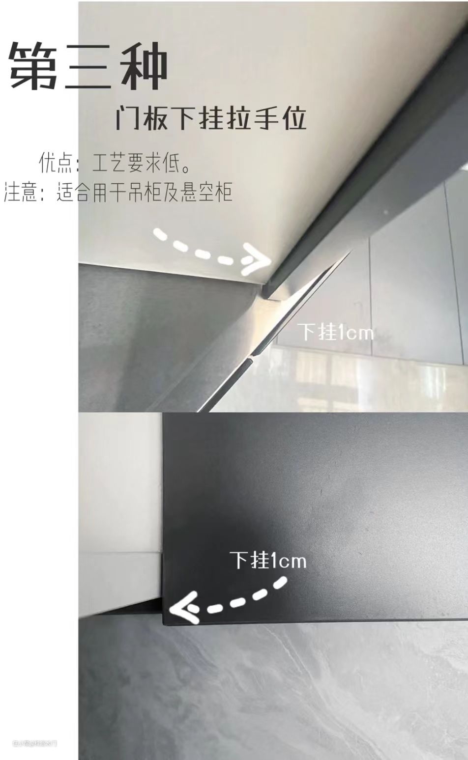 第三种下挂门板:适用于吊柜做下挂门板。对于工艺要求比较低,一般不会加钱