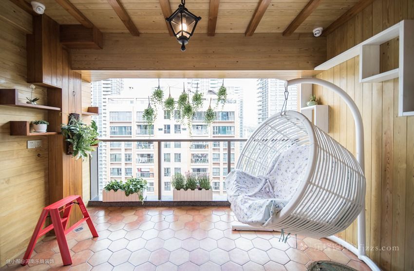 满足基本的洗衣晾晒功能,可以在阳台另一侧设计成多功能区,可以根据每家的需求来设计,如果是爱花之人,可以种一些花花草草,也可以放一个吊椅作休闲娱乐区。