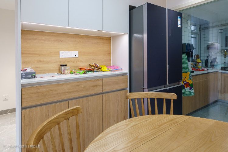 餐厅沿着2200mm长度墙体做了柜子,左边留了一个台面空间,加入插座和灯光设计,可以放置一些小家电及小物品,右边为双开门冰箱预留了内嵌位置,为日常生活提供了便利。
