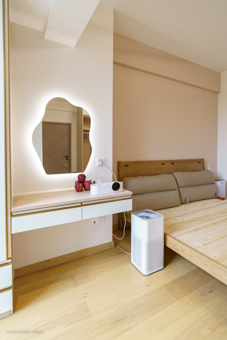 没有采用传统的筒灯,选择了流行的无主灯设计,使空间更加的简洁清爽,视觉效果也更加的开阔。床头一侧利用凸出的墙面定制了壁挂式梳妆台。镜面也是选择了流行的不规则状,背开一条灯光槽作为氛围灯光,增加整体宁静温柔的空间氛围。