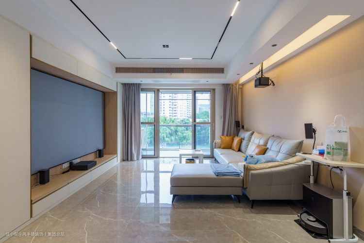 客厅打造了白色I型地柜,上面定制了2000mm长度的收纳柜,中间预留了2000mm*1400mm尺寸的位置,放置100寸抗光画框幕布,下方预留了插座,平时可以用放置影音设备。