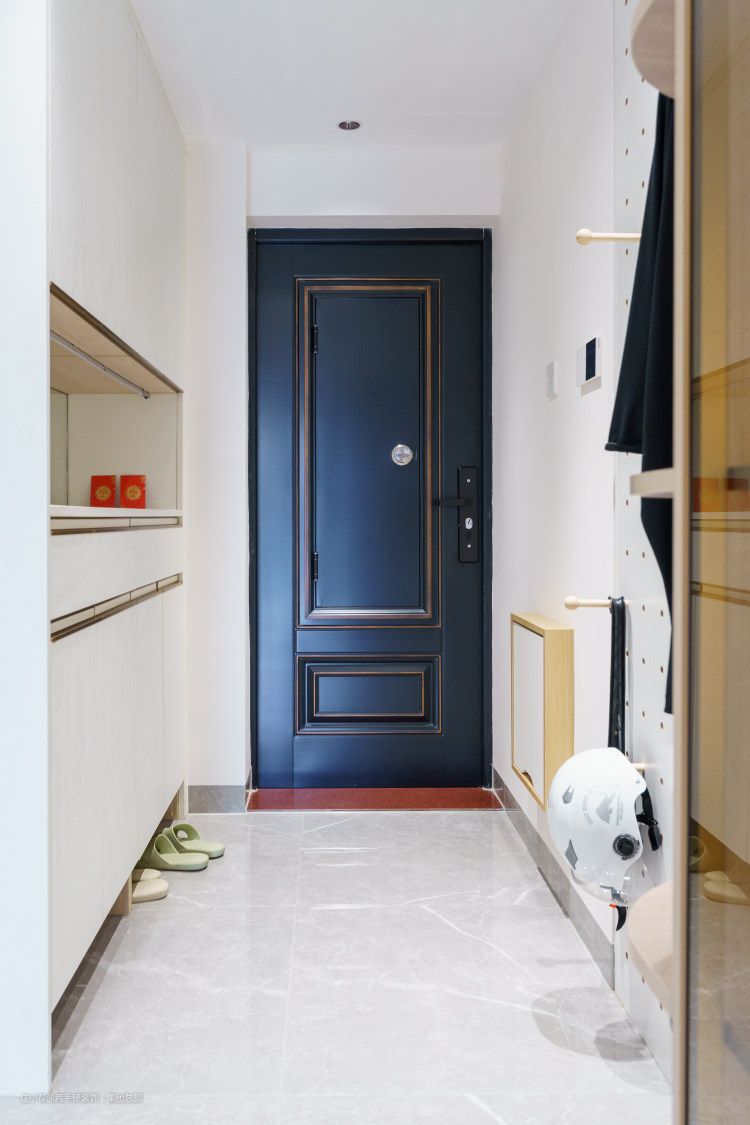 玄关进门侧边沿着墙体新建100mm窄墙体,内嵌一排玄关柜体,乳白配色确定了房子的主色调。配备抽屉、常鞋位、中部端景台,柜门采用回弹器,整体简洁利落。 另一侧布置了1000mm*2800mm的洞洞板,头盔、钥匙、雨扇等都可以挂置,增强收纳的同时墙面又得到美化。