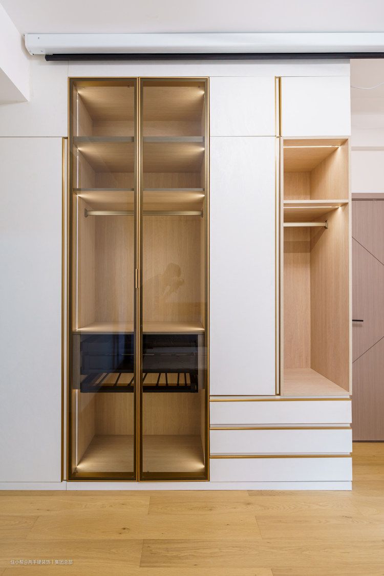 另一侧做的隔层收纳,预留了梳妆台跟插座的位置,高低柜的设计让空间更加开阔。纯白的色调拼接了原木色,再加上充沛的自然光,小空间给人的感觉格外明亮、干净。